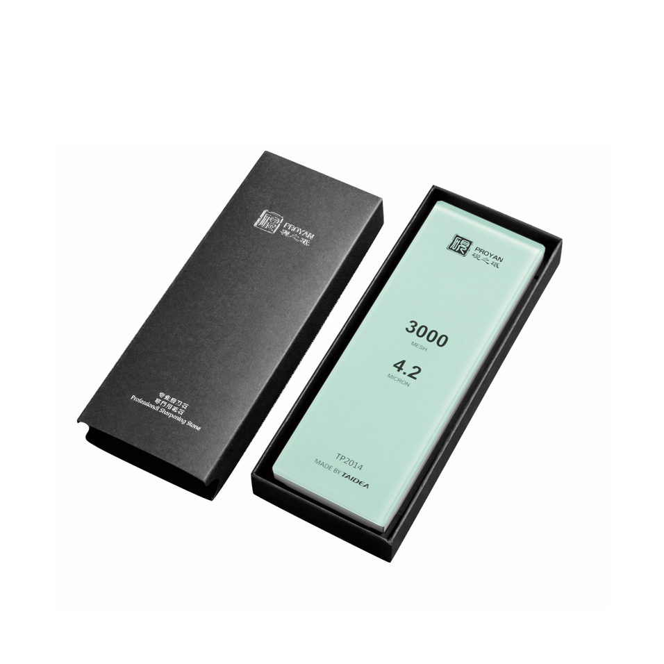 PRO-YAN glass stones, made of corundum, are manufactured using a new, environmentally friendly room temperature consolidation process. Corundum is a finer and softer material than traditional ceramic stones, allowing the knife to glide more easily over the surface. The abrasive concentration is also higher, which speeds up the sharpening process.